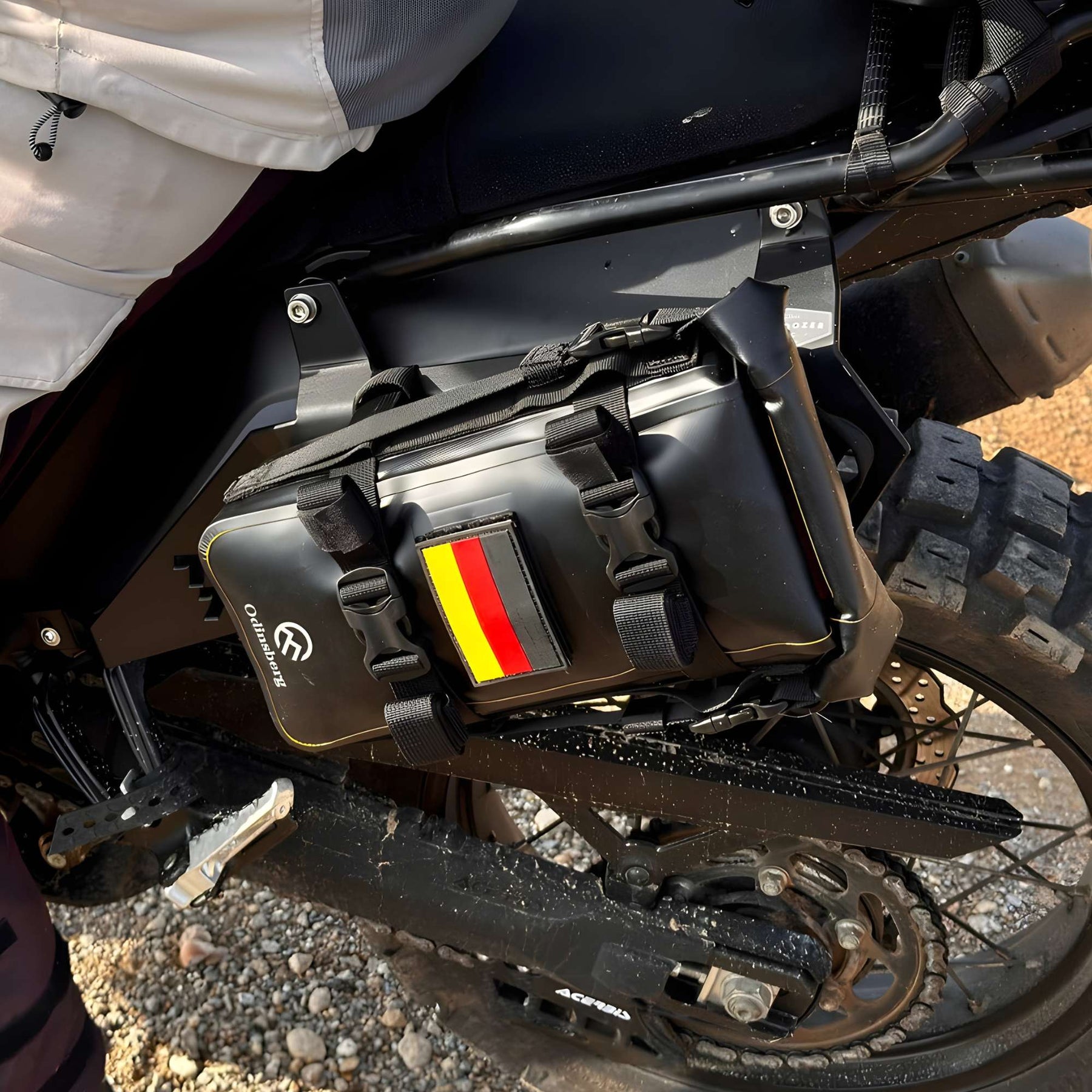 The Ragnarök 3.5L can be mounted horizontally or vertically. It fits universally on any crash bar, tail or pannier rack. You can also mount it directly on the seat or saddle by looping the lanyard loops together under the seat or attaching them to the subframe.